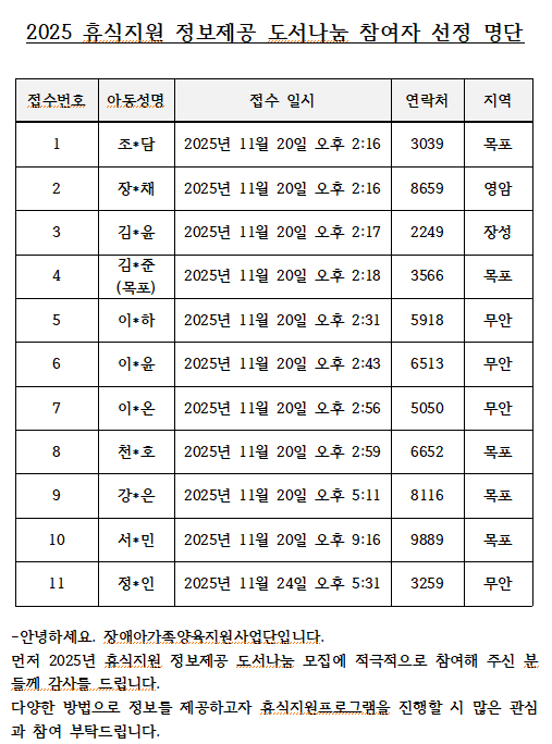 2025년 휴식지원 정보제공 도서나눔 참여자 선정 명단